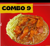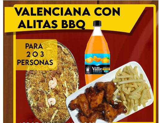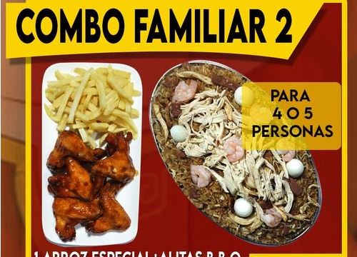 Arroz especial de arroz chino acompañado de pollo desmechado, cerdo, jamón, camarón y huevo, con alitas BBQ, francesa y gaseosa 1.5 L. Para 3 o 4 personas.