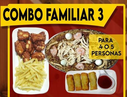 Arroz especial de arroz chino acompañado de pollo desmechado, cerdo, jamón, camarón y huevo, con costillas BBQ, rollitos, francesa y gaseosa 1.5 L. Para 3 o 4 personas.