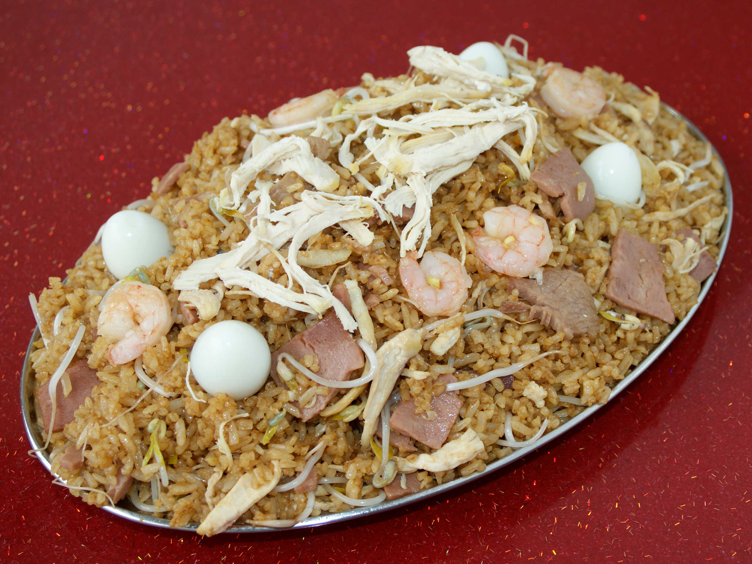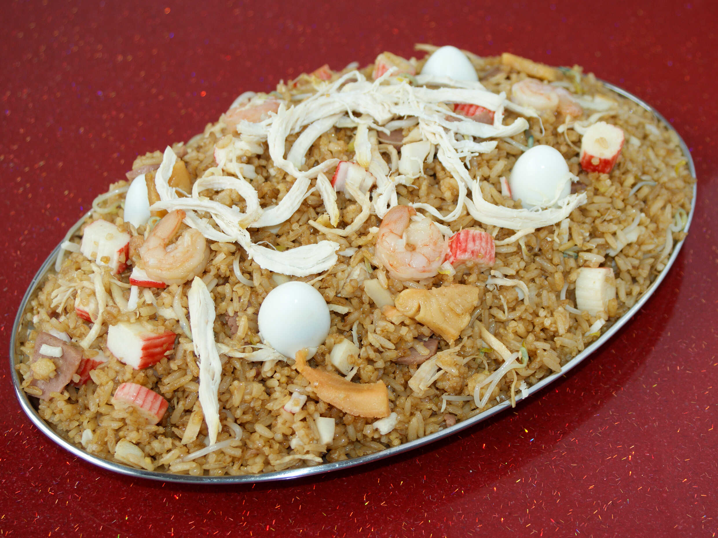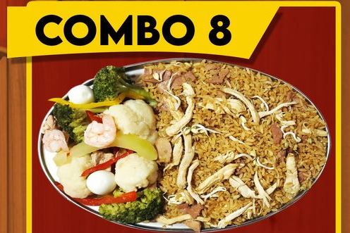 Arroz especial para 2–3 personas (aprox. 1200 g): arroz chino acompañado de pollo desmechado, cerdo, jamón, camarón y huevo de codorniz.