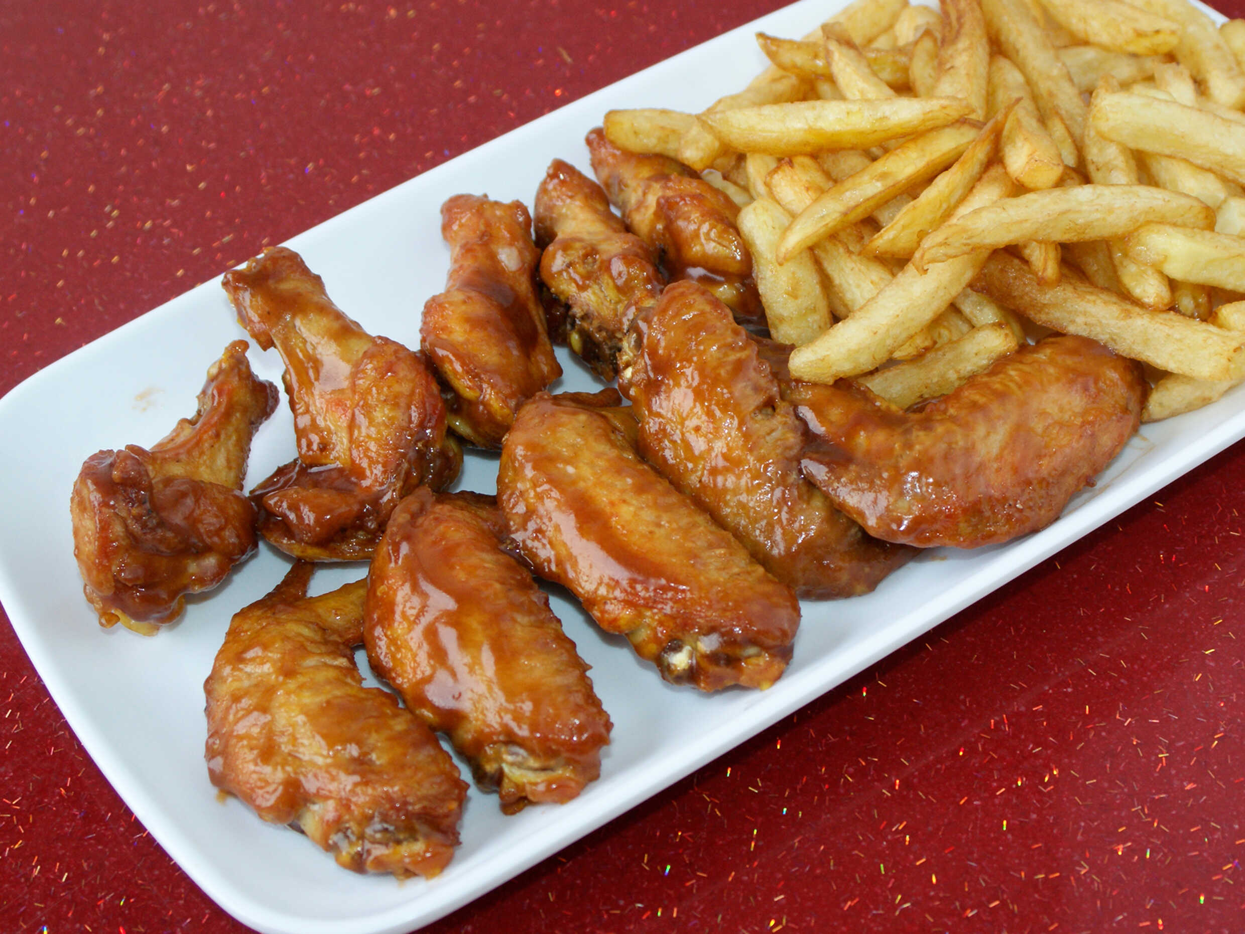 5 Alitas BBQ, acompañadas de papa francesa.