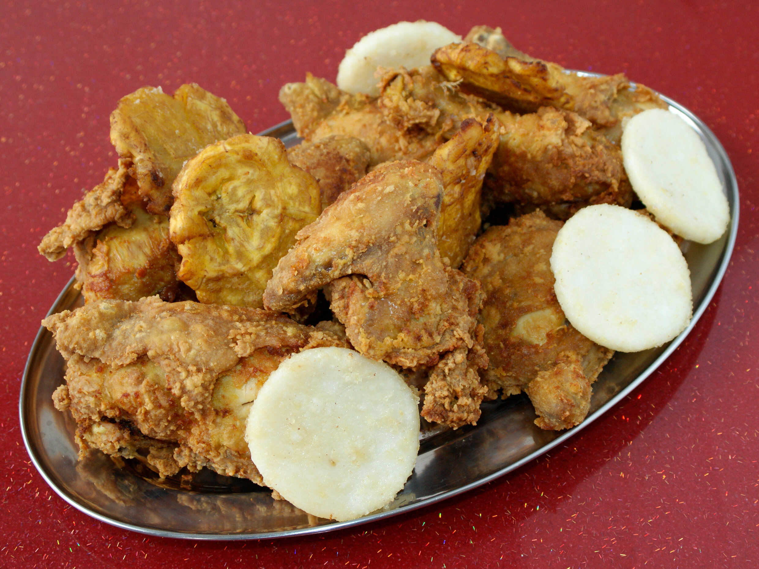 1/4 Pollo broaster, acompañado de yuca y patacón.