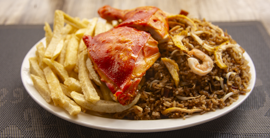 Arroz chino, cerdo, jamón, pollo desmechado, raíz, cebollín con papas a la francesa y 1 presa pollo frito más gaseosa 250 ml.
