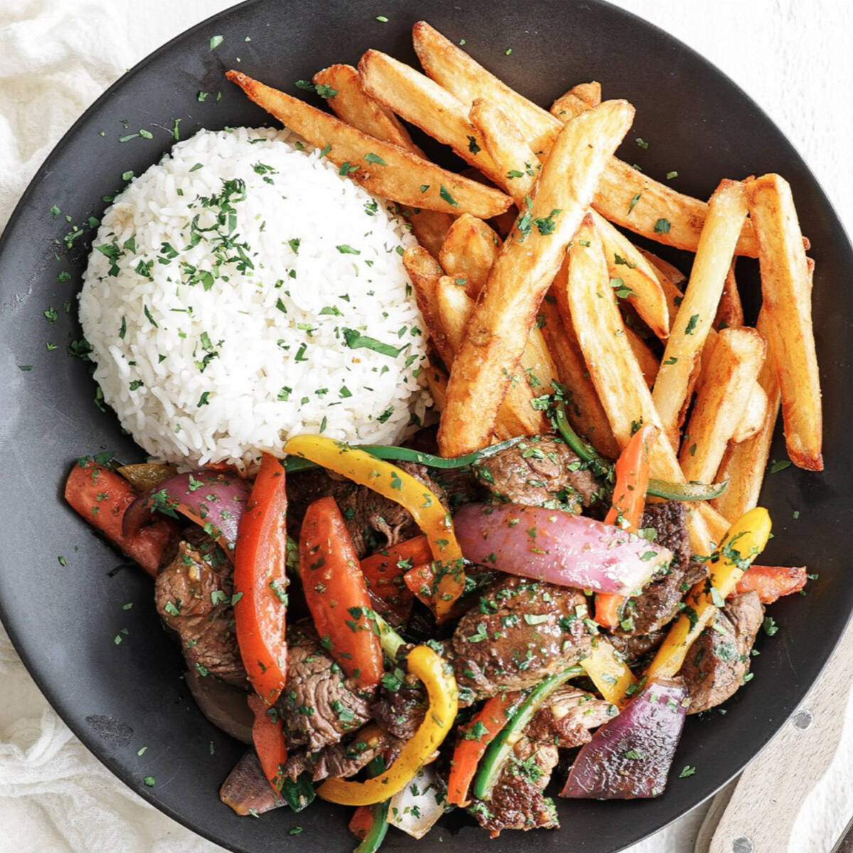 Un salto de sabor! Uno de los platos mas populares de perú con influencias chinas. Tiras de lomo de res, salteadas con cebolla, tomate y sillao', servido con crujientes papas fritas y arroz. Un plato jugoso, intenso y lleno de tradición.
