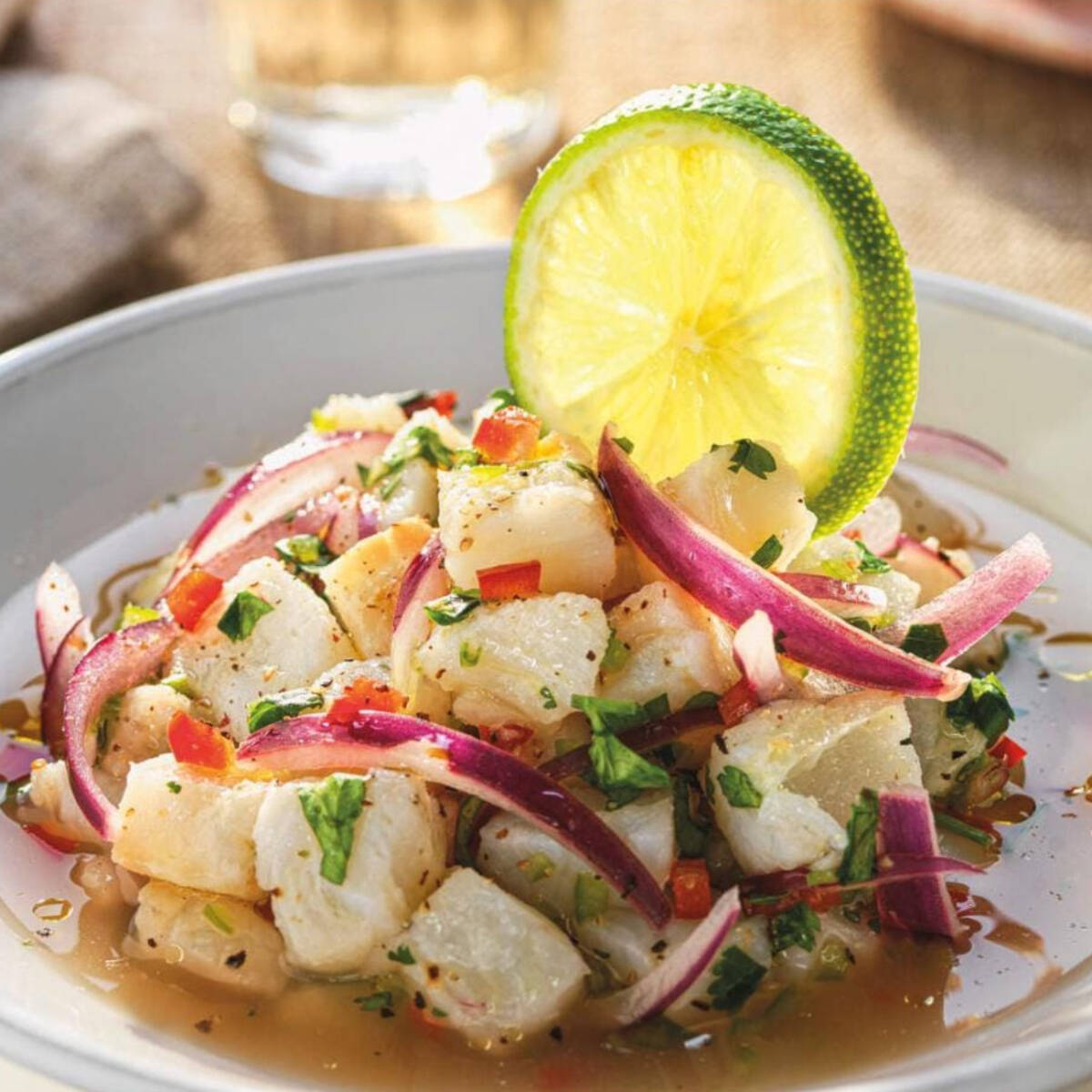 Uno de los platos más emblemáticos de perú. Siente el sabor del mar en cada bocado! Ceviche peruano hecho con pescado fresco marinado en jugo de limón, mezclado con cebolla en rodajas, ají y cilantro. Un plato fresco e intenso lleno de tradición.