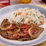 Bandeja con arroz, carne asada o carne en bistec y arepa