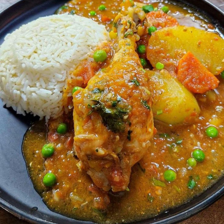Pollo en salsa, acompañado de sopa del día, arroz, principio del día y jugo del día.