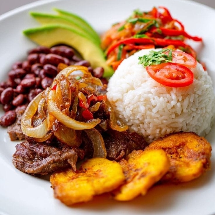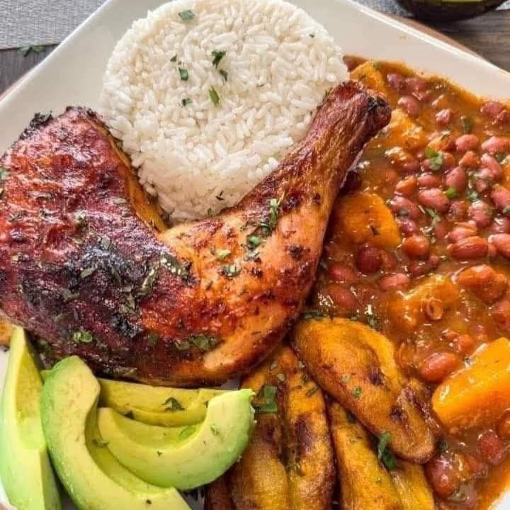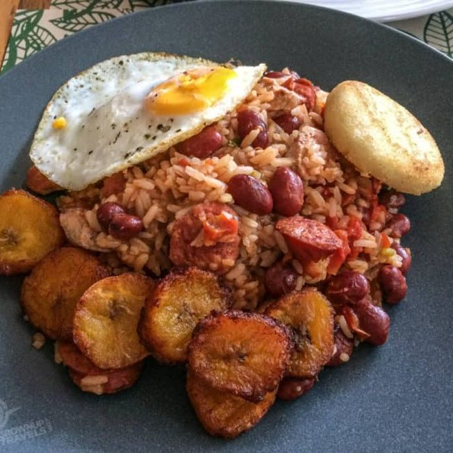 Frijoles, arroz blanco, carne molida, chicharrón, huevo frito, aguacate, tajadas de plátano maduro, chorizo, y jugo del día 9 oz (platillo personal)