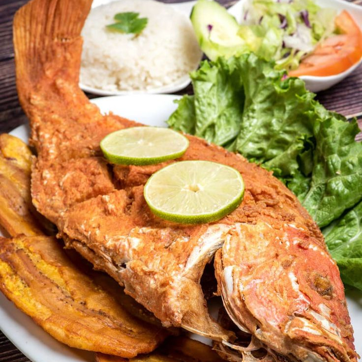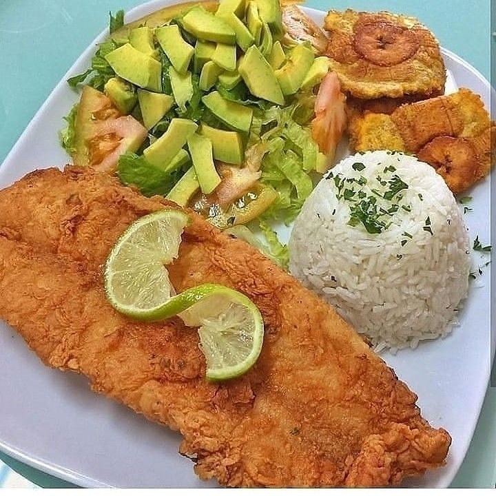mojarra acompañada con sopa o fruta, papa a la francesa, arroz, ensalada y jugo del día.