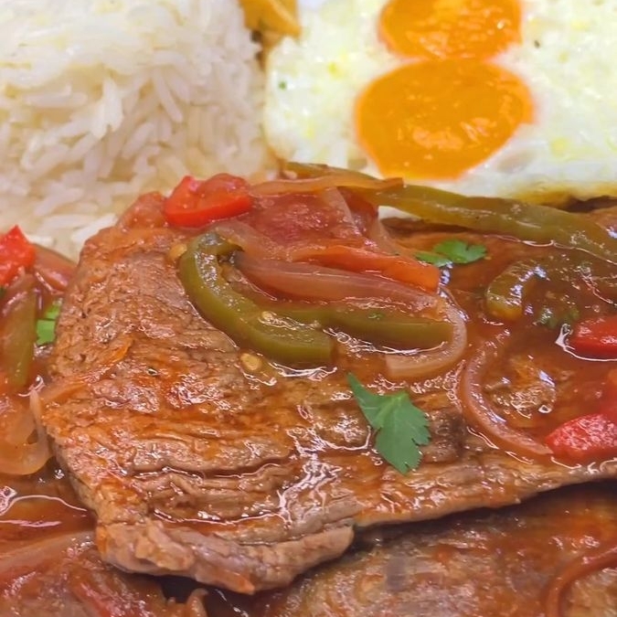 carne en bistec con sopa del día, o fruta, arroz, principio del día, ensalada y jugo del día.