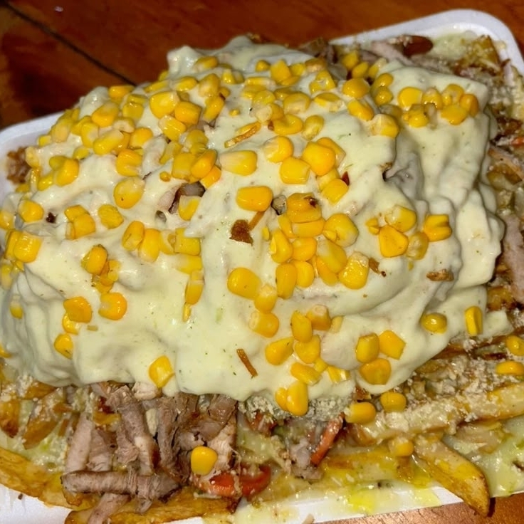 acompañada de papas, salchichas, queso, pechuga, maíz, y (salsas) y jugo del día..