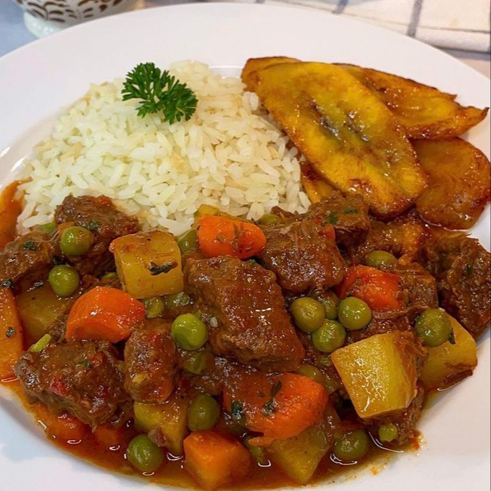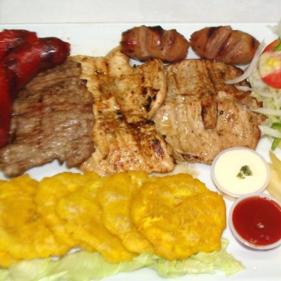 acompañado con carne de cerdo, pechuga, carne de res, sopa del día, papas, arroz, aguacate, ensalada, y jugo del día.