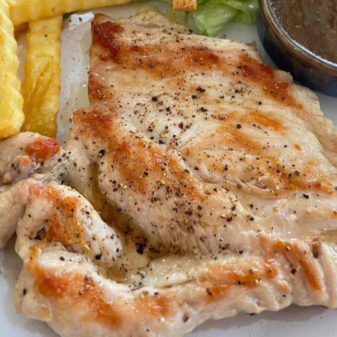 Almuerzo Corriente completo acompañado con cerdo asado, sopa o fruta, principio frijol o ensalada (lechuga, tomate, y cebolla) y jugo del día.