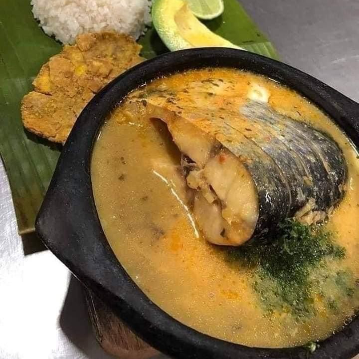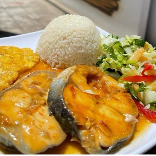 Pescado en salsa, acompañado con sopa del día o fruta, arroz, principio del día, ensalada y jugo del día.