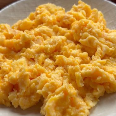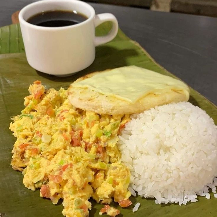 huevos revueltos, con arroz, arepa, y bebida ( chocolate o café).