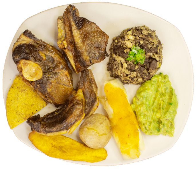 Acompañado con yuca, papa salada, guacamole y arepa.
