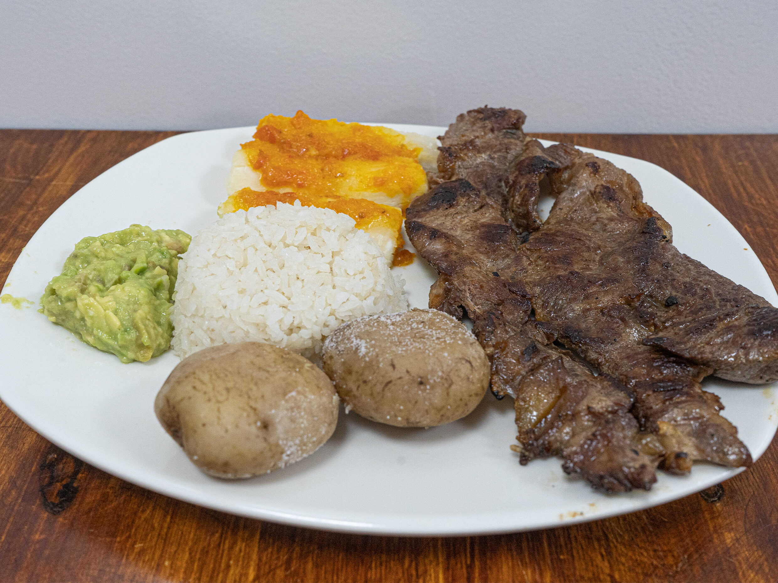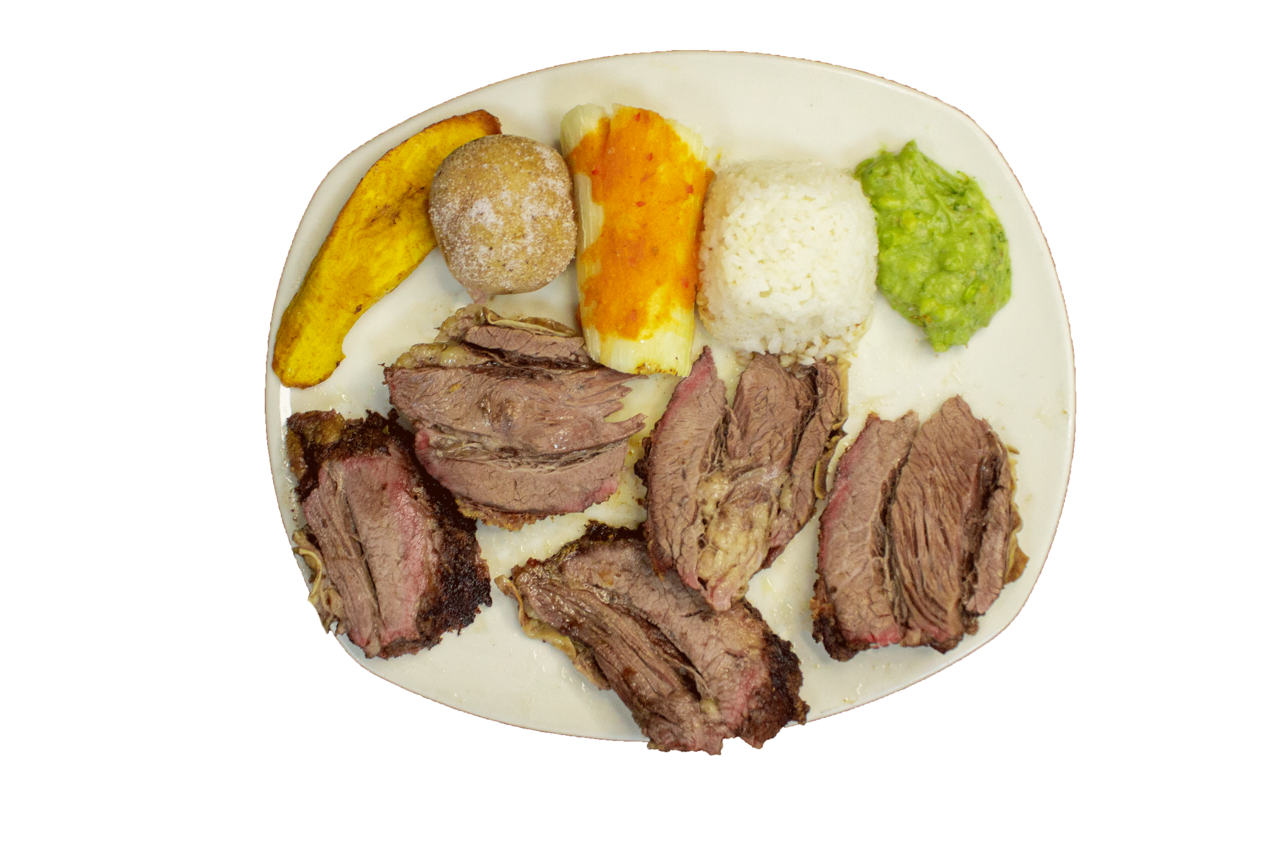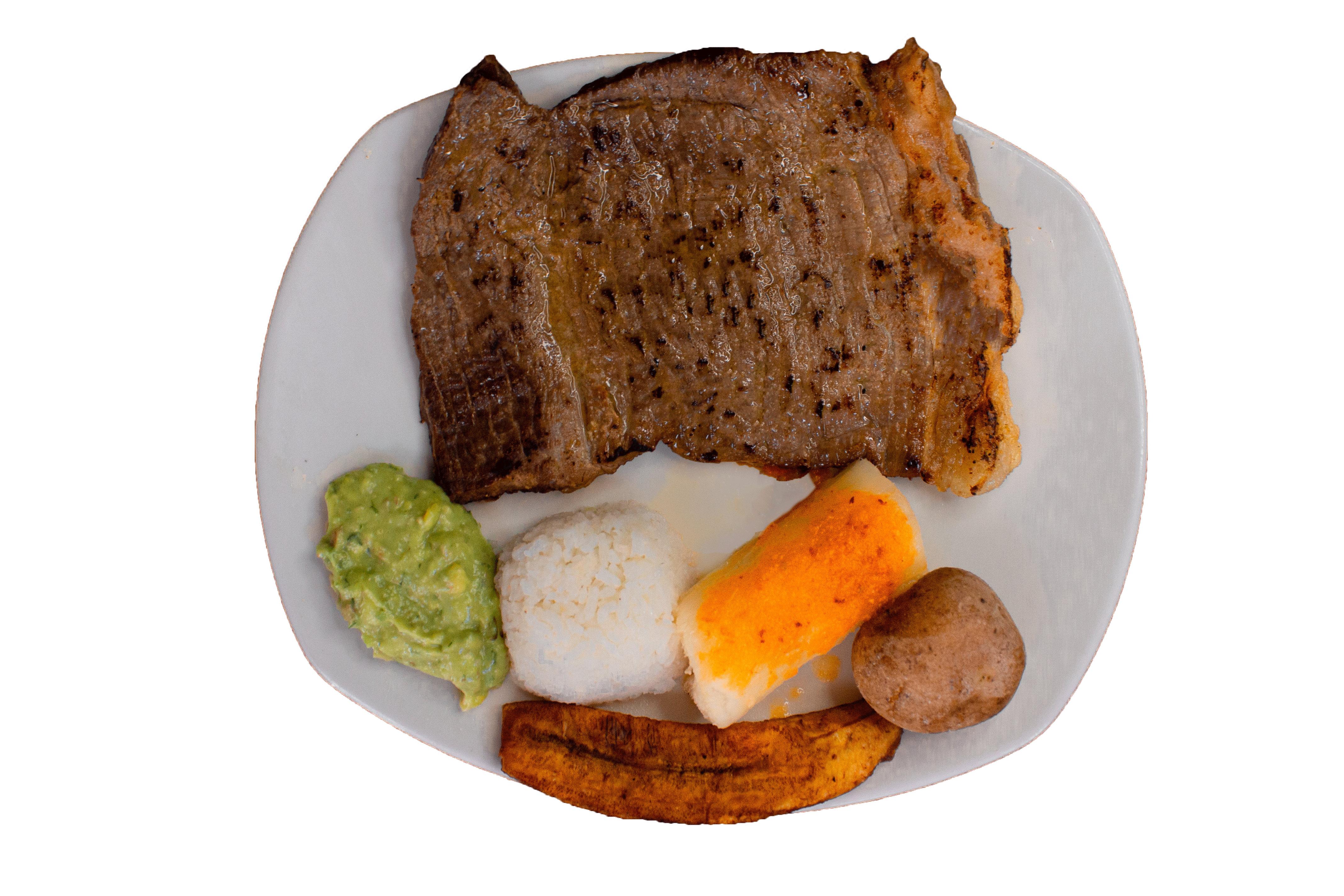 Churrasco (380 gr aprox), papa salada, arroz, yuca y aguacate.