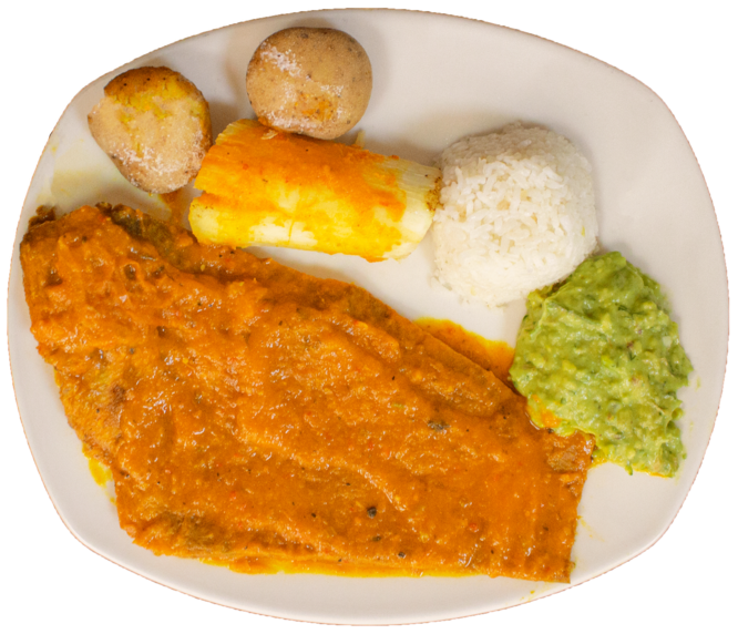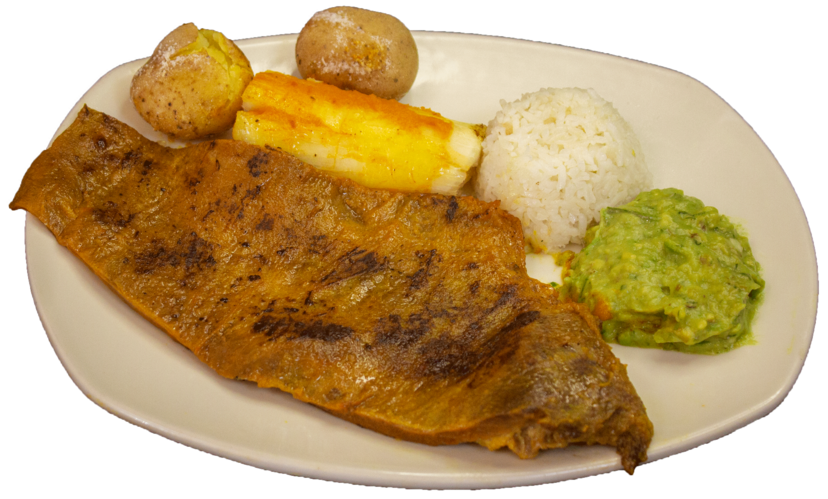 Sobrebarriga Dorada (380 gr aprox), papa salada, arroz, yuca y aguacate.