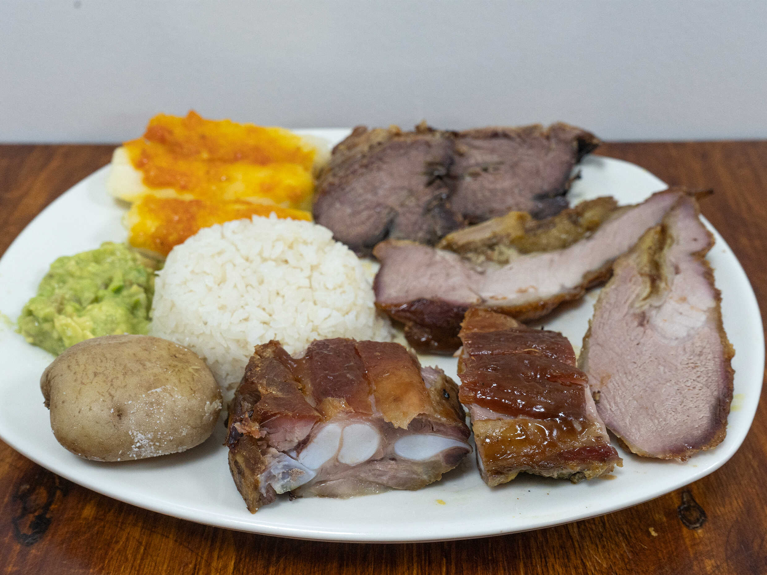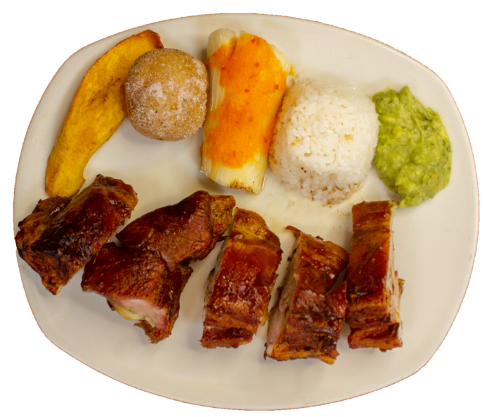 Costilla de Cerdo (300gr aprox), papa salada, yuca,arroz guacamole y sopa del dia