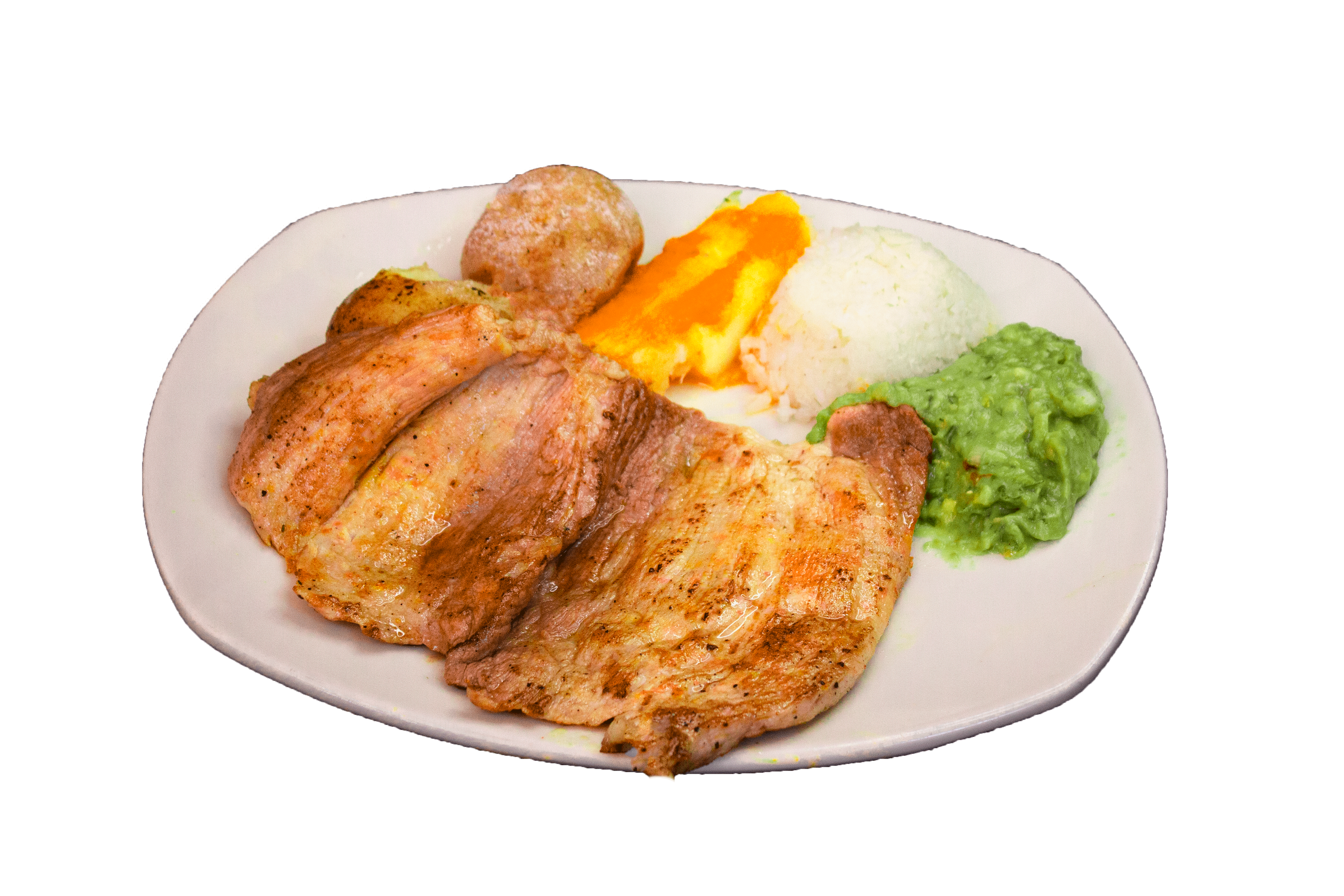 Lomo de Cerdo Asado (300 gr aprox), papa salada, arroz, yuca guacamole y sopa del dia.