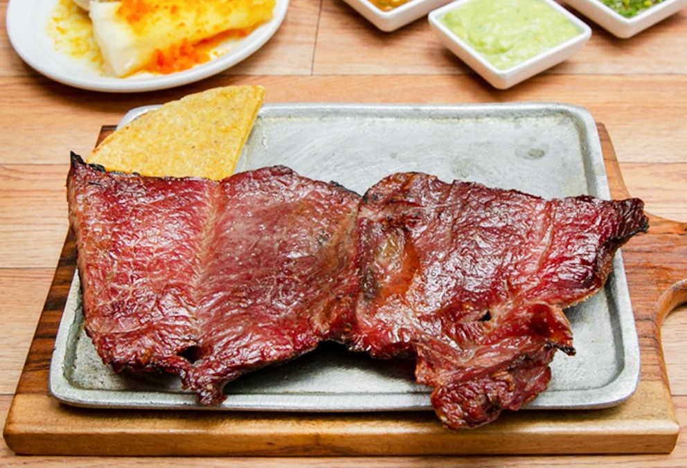 Sobrebarriga asada o en salsa a elección, acompañada de papa, yuca y arepa.