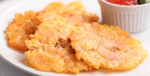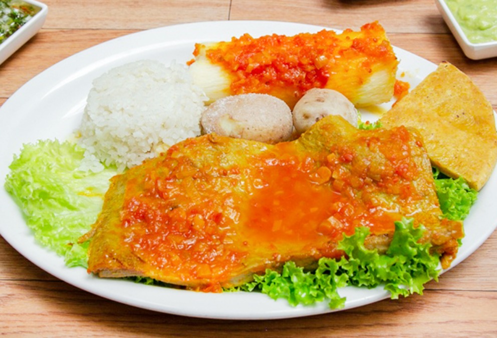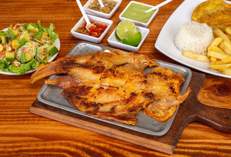 Mojarra frita acompañada de arroz, ensalada (tomate, cebolla, lechuga, aguacate y pepino), patacón y papa francesa.