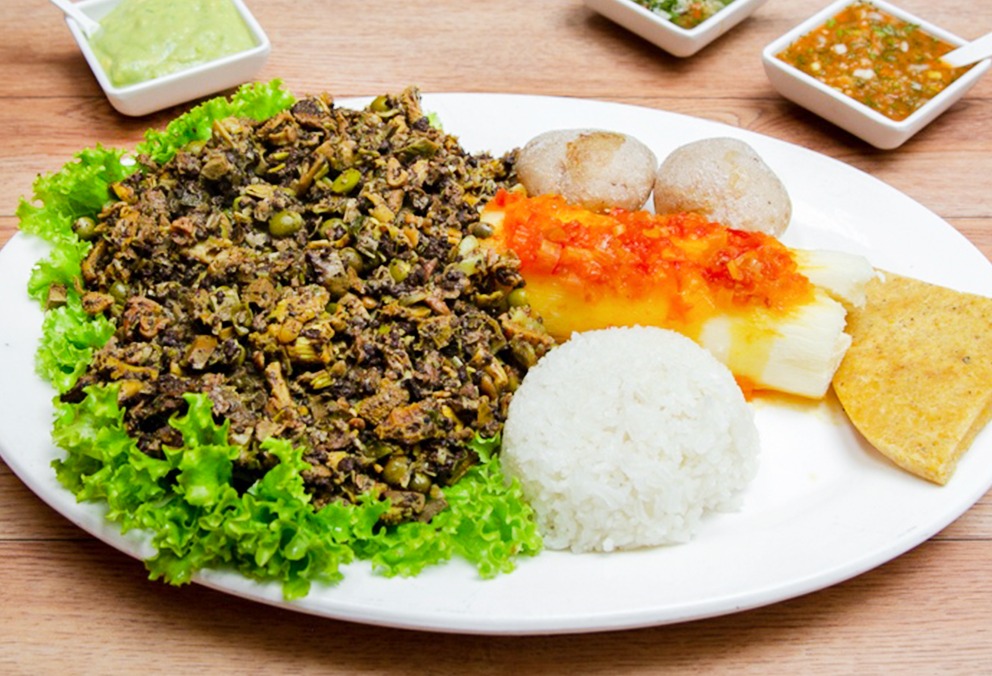 Mute santandereano acompañado de arroz, aguacate y arepa.
