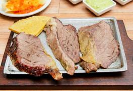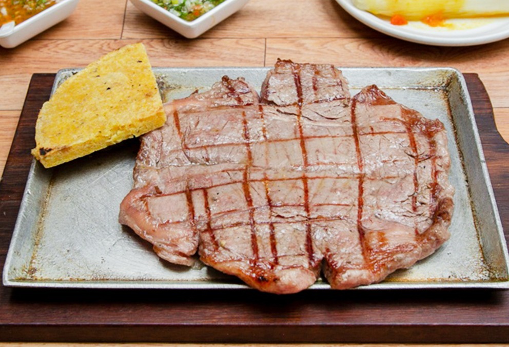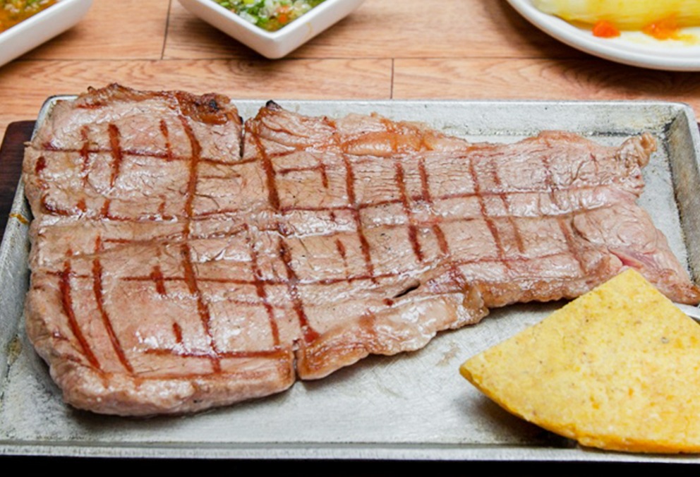 Porción de punta de lomo acompañada de papa, yuca y arepa.