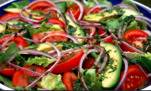 Mojarra a la plancha acompañada de arroz, ensalada (tomate, cebolla, lechuga, aguacate y pepino), patacón y papa francesa.