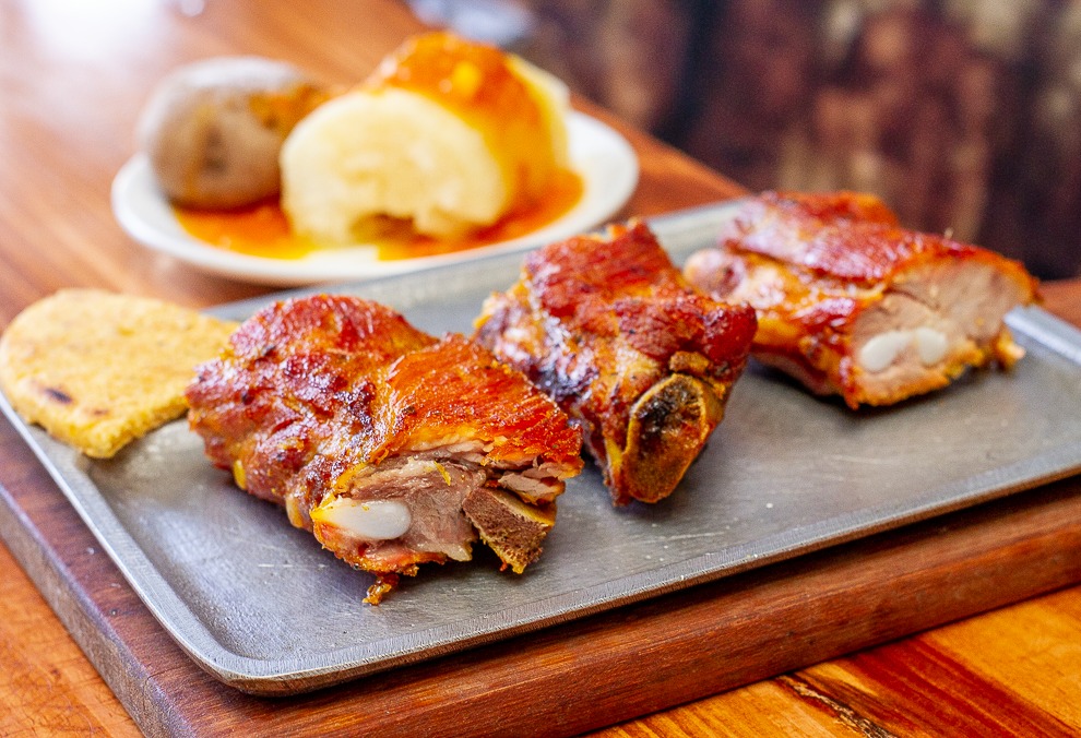 Porción de costillas BBQ acompañadas de papa, yuca.