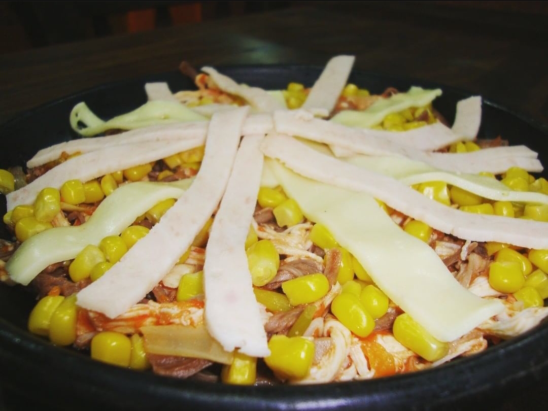 Mazorcada con pollo y carne desmechados en salsa, queso fundido, champiñón, huevos de codorniz, mazorca tierna, tocineta, papa cabello de ángel y salsas.