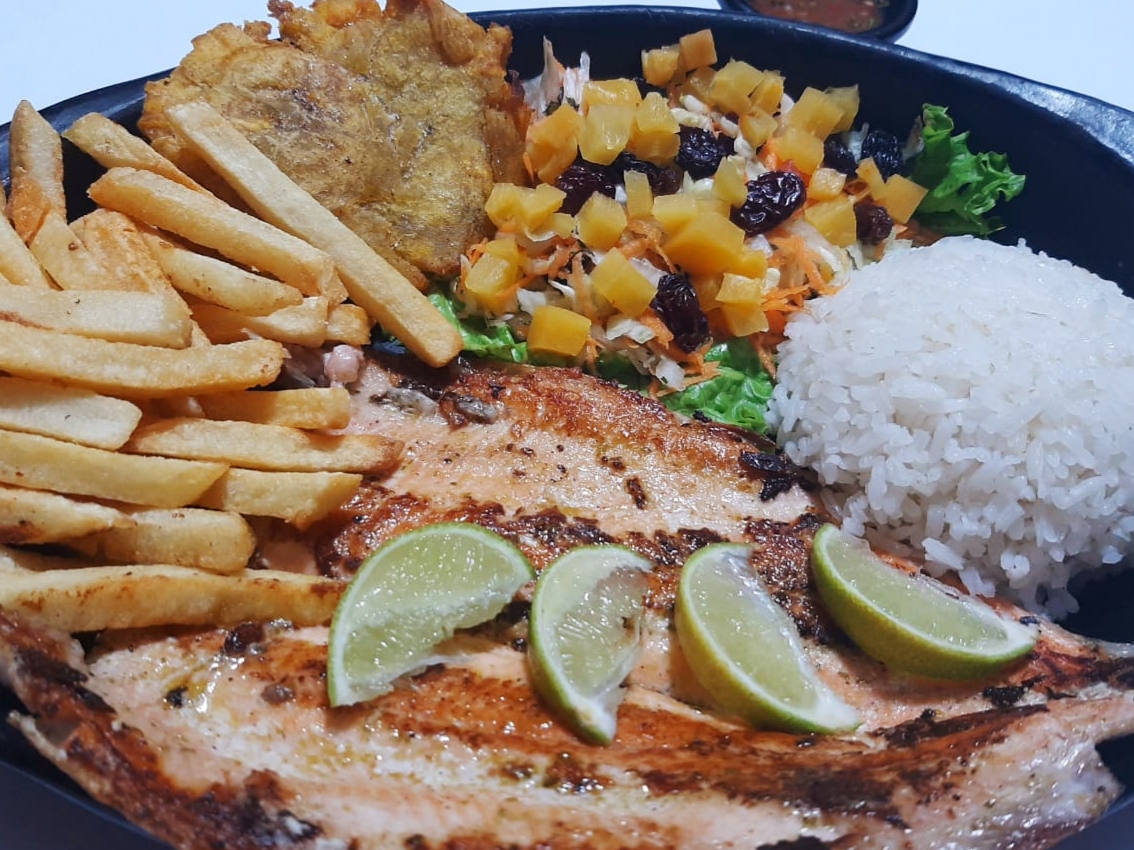 Acompañada de patacón, arroz, papas fritas y ensalada