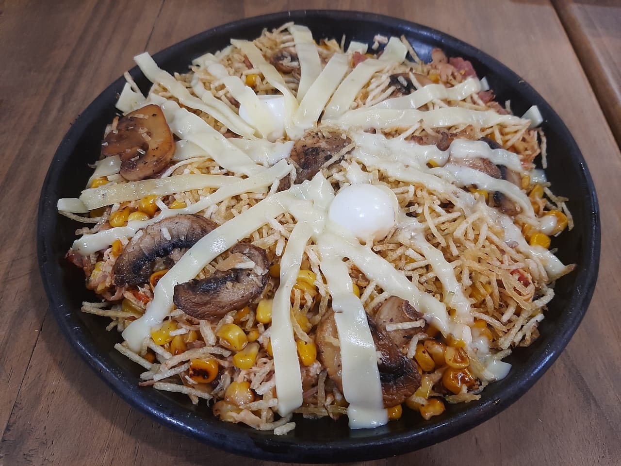 Mazorcada con carne a elección desmechada en salsa, queso fundido, champiñón, huevos de codorniz, mazorca tierna, tocineta, papa cabello de ángel y salsas.