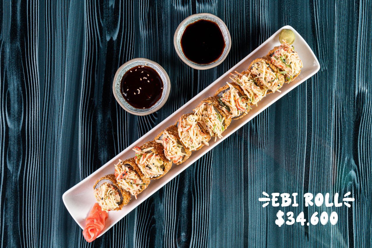 (Roll tempura) Relleno: Langostino y queso crema. Topping: Con pasta crocante y salsa a base de mayonesa japonesa ligeramente picante y kanikama.