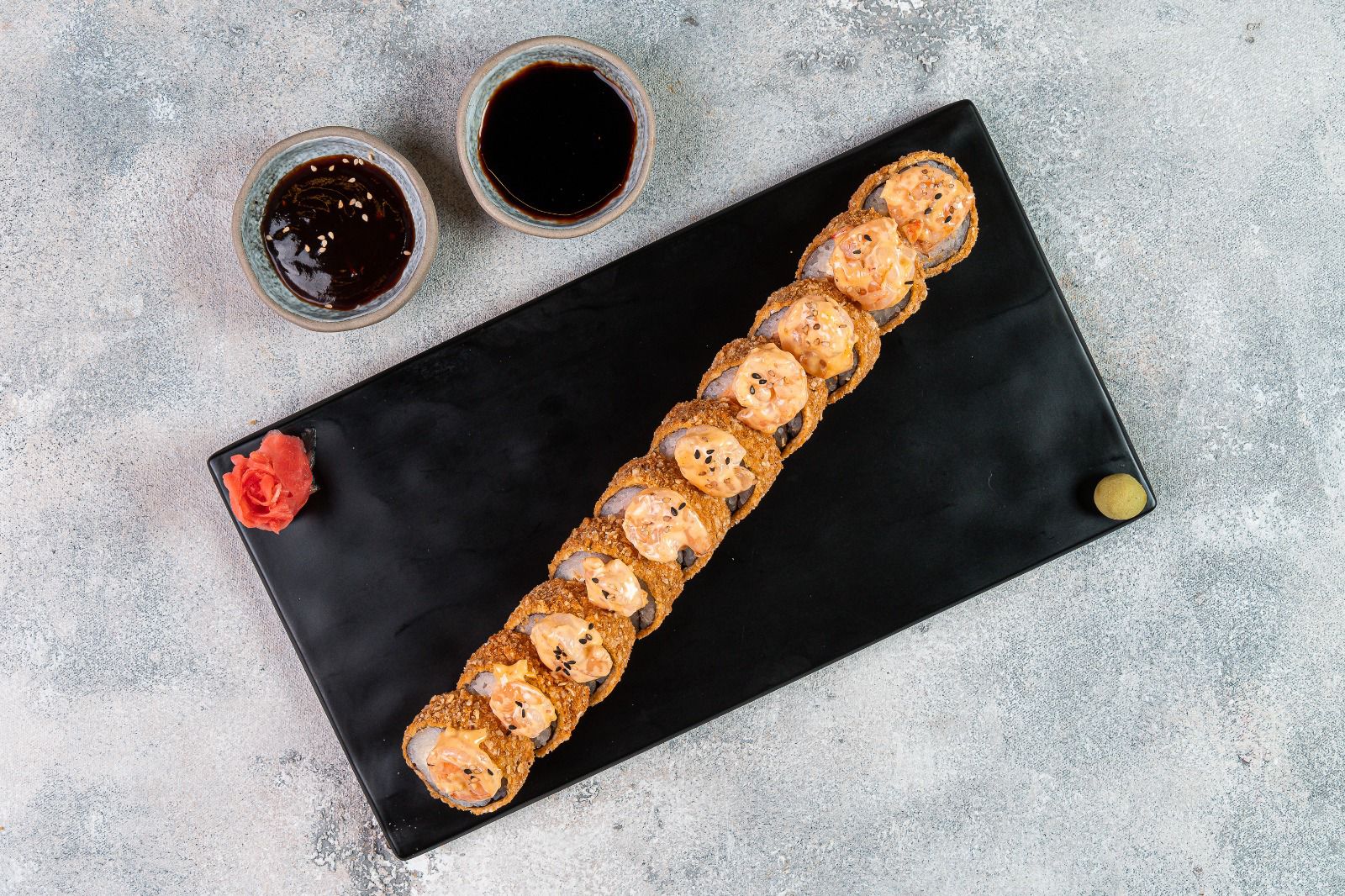 (Roll tempura) Relleno: Queso crema, salmón, aguacate. Topping: 10 camarones bañados en salsa japonesa y teriyaki