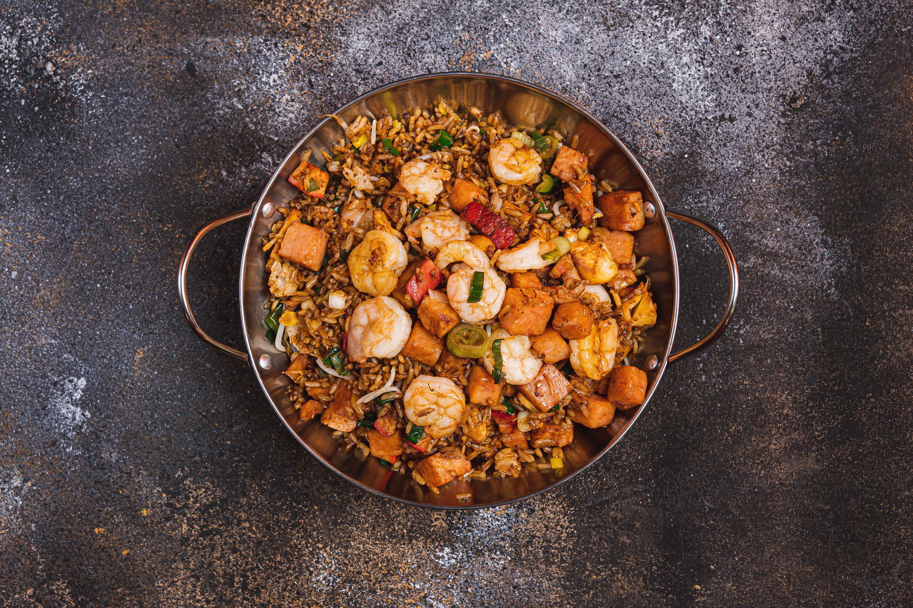 Arroz frito salteado con raíces chines, cebollin, cerdo, jamón, pollo y camarones.