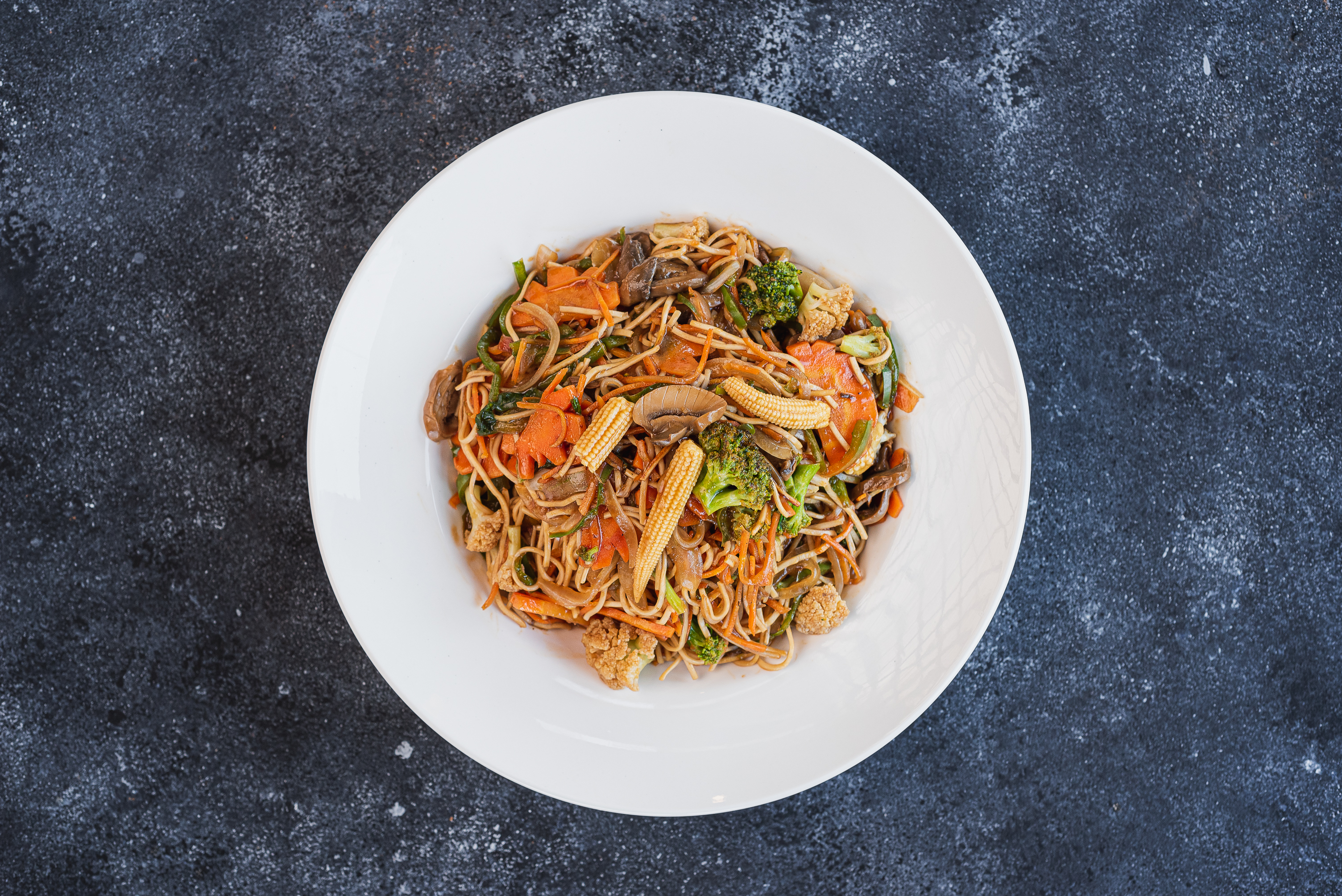 Tallarines con zanahoria, pimenton, brocoli, coliflor, cebolla salteados en salsa de soya