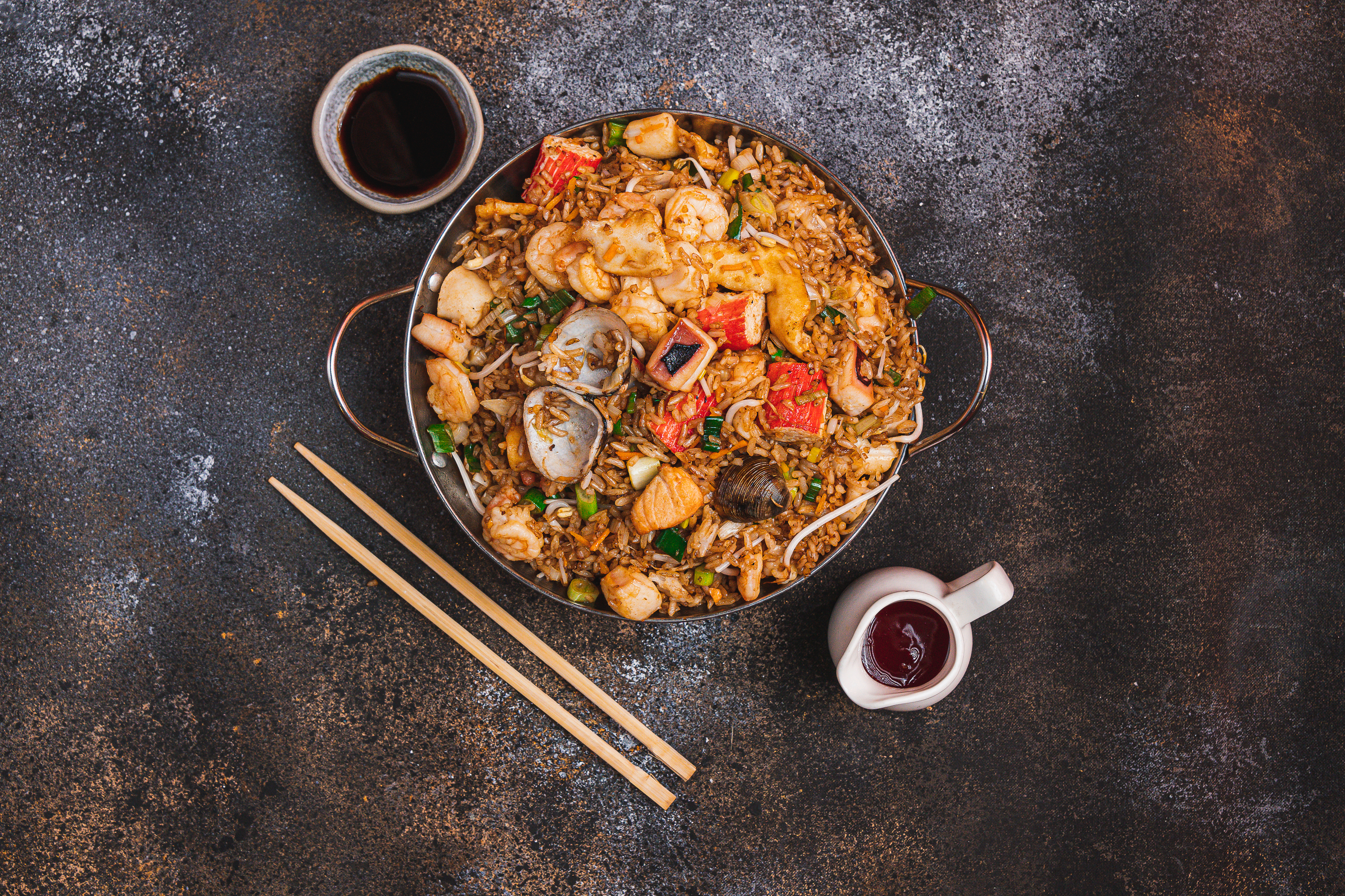 Arroz frito salteado con soya, cebollín, raíces chinas y frutos del mar (Camarón, calamar, palmito de cangrejo y mejillones)