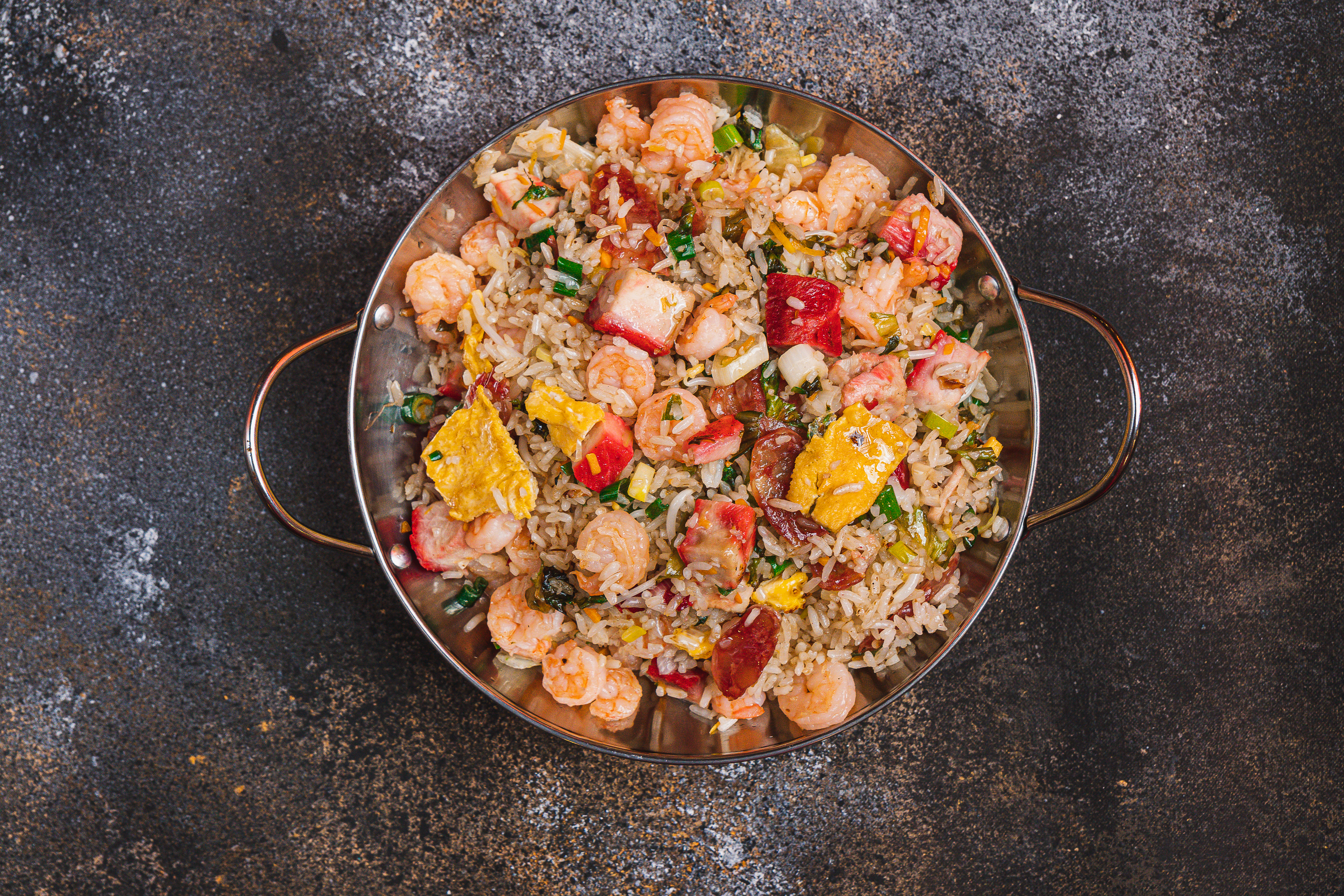 Arroz frito salteado SIN soya, con raíces chinas, lechuga, cebollin, camarones, chorizo chino (ligeramente dulce) y tiras de cerdo horneado.