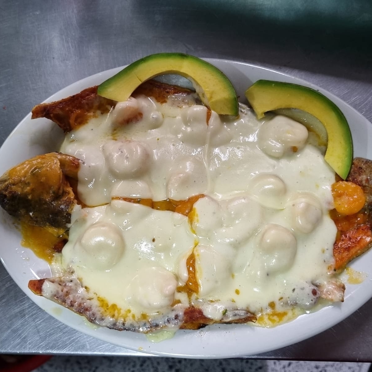 TRUCHA CON CAMARONES, ARROZ, FRANCESA, PLATANO Y AGUACATE.