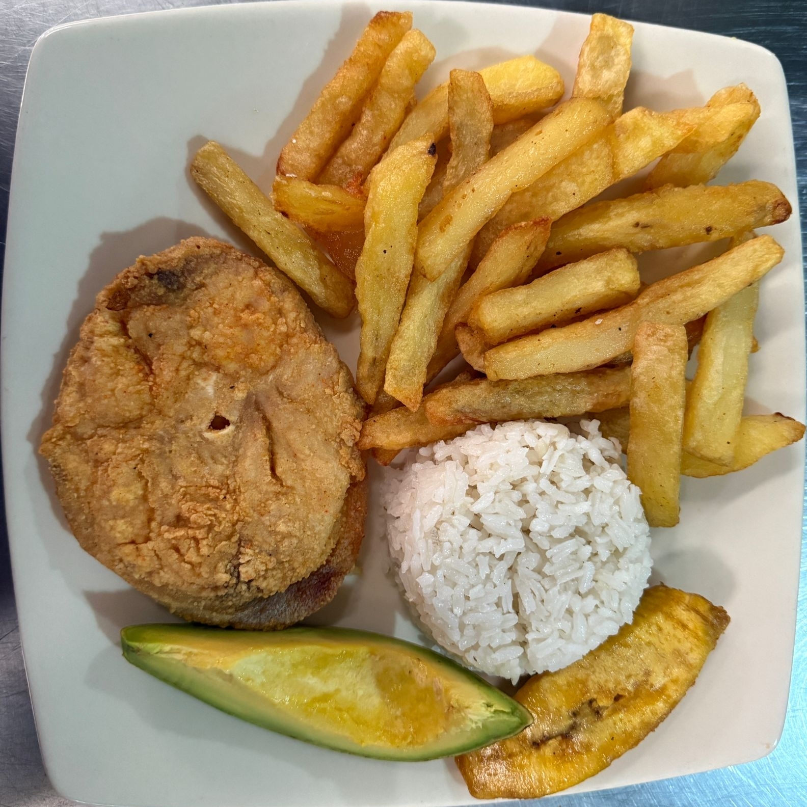 BAGRE FRITO, ARROZ, FRANCESA, PLATANO Y AGUACATE.