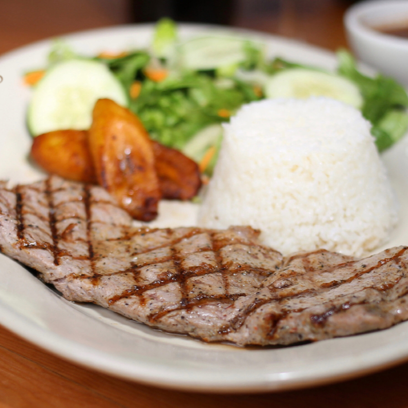 CARNE ASADA, ARROZ, FRANCESA, PLATANO, SOPA DEL DIA Y LIMONADA.