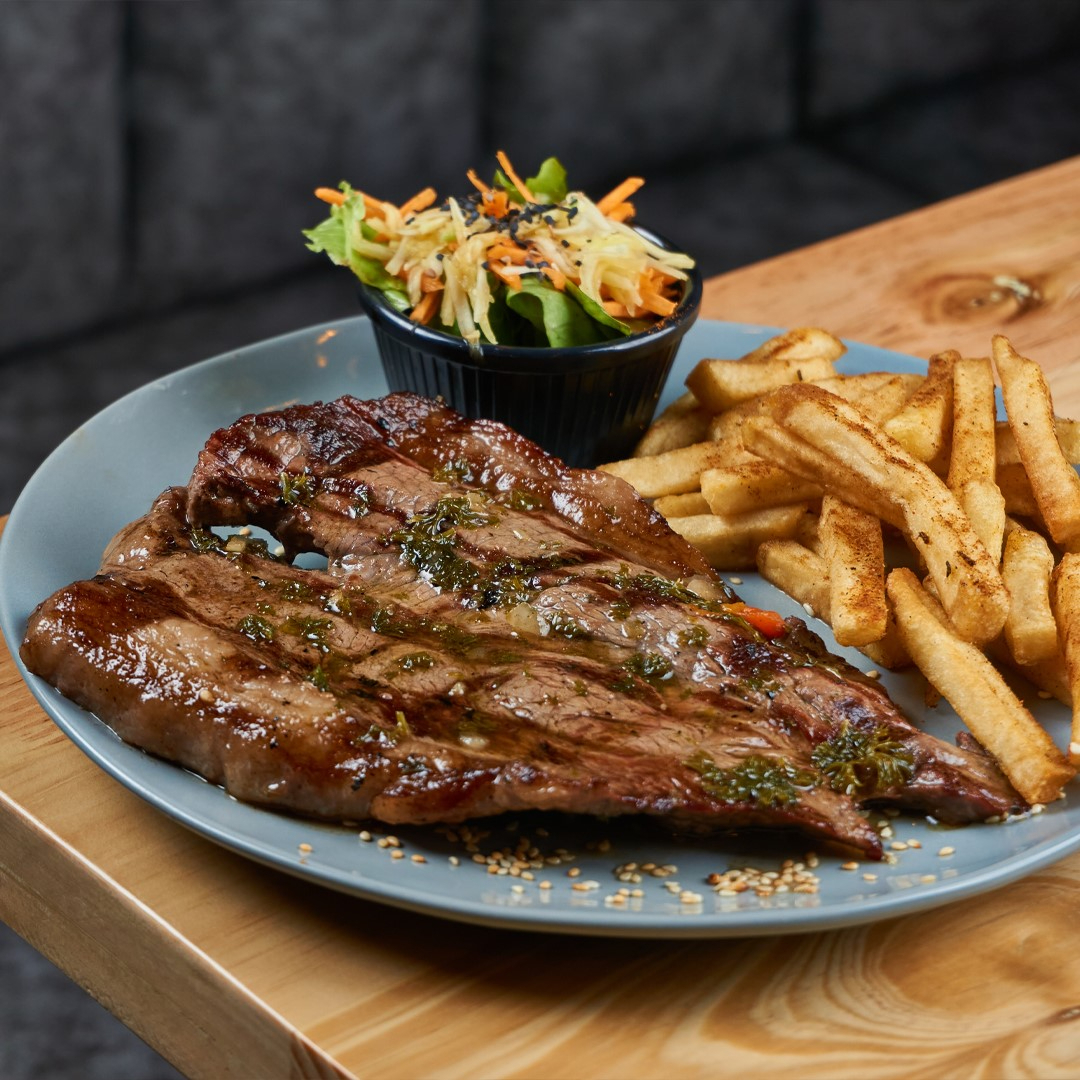 CHURRASCO, FRANCESA, PLATANO, EMSALADA Y AGUACATE