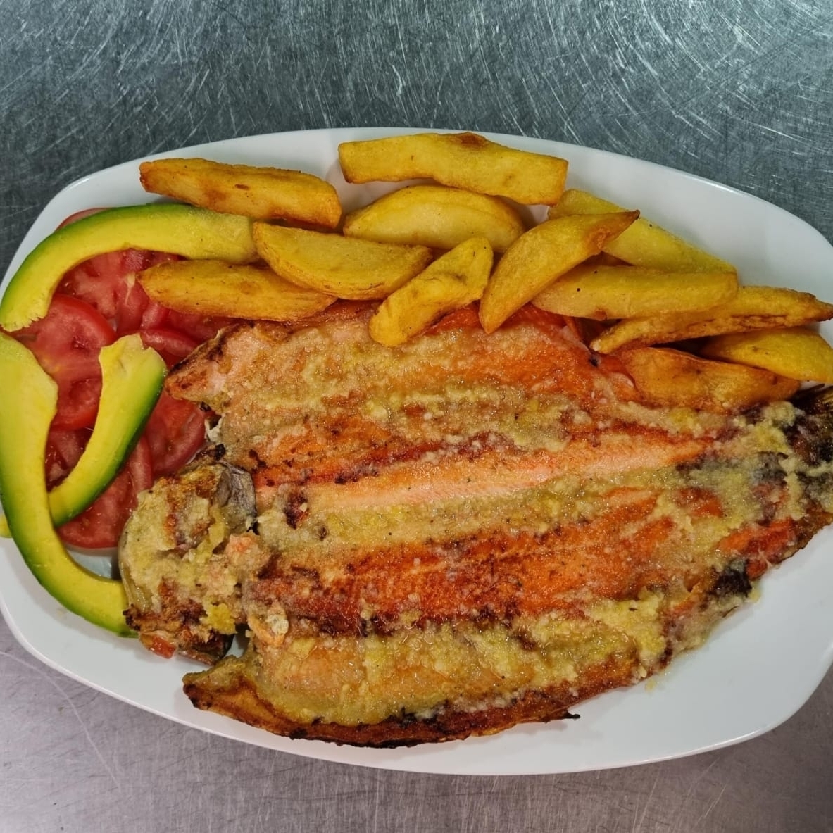 TRUCHA A LA PLANCHA,ARROZ, FRANCESA, PLATANO Y AGUACATE.