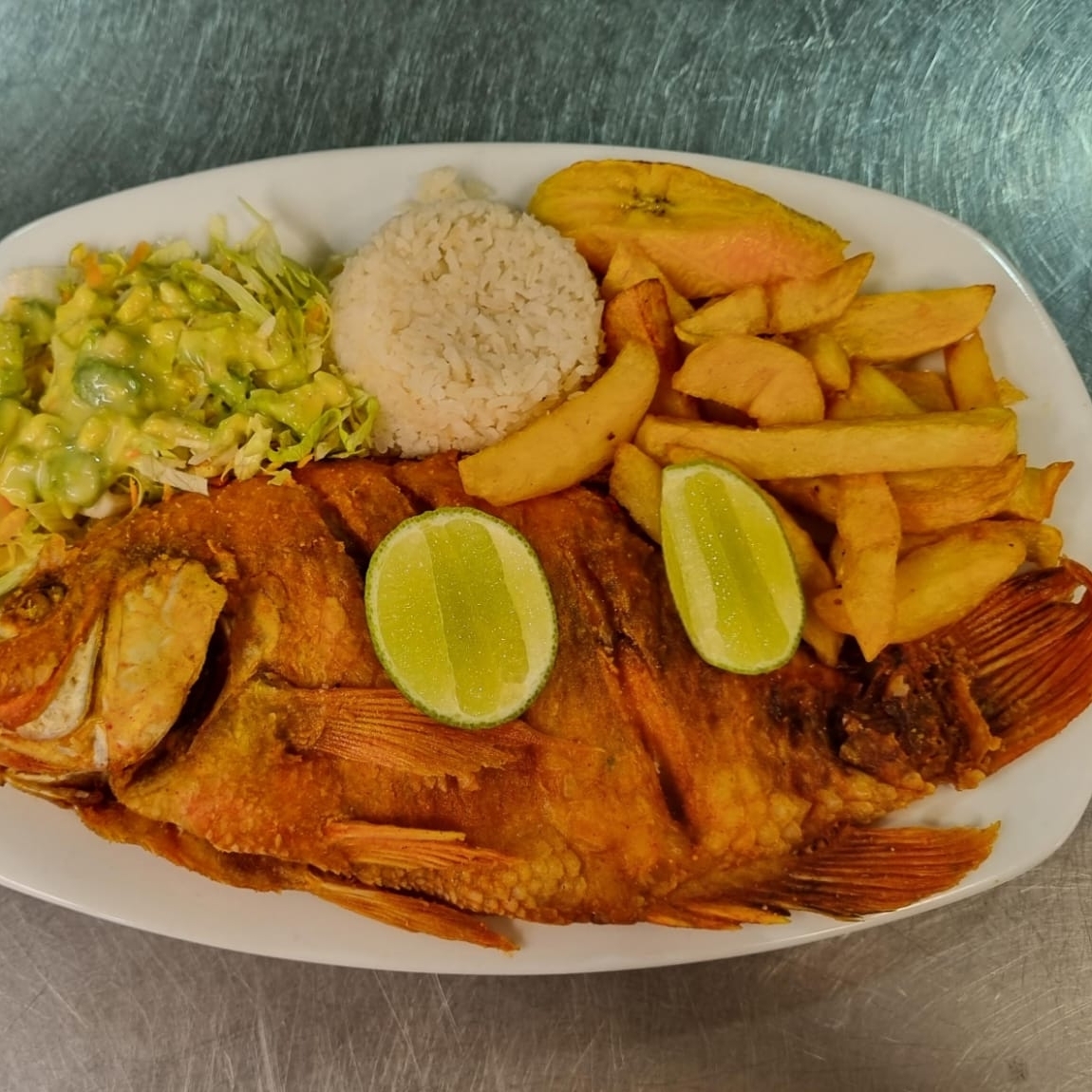 MOJARRA ESPECIAL,ARROZ, FRANESA, PLATANO Y ENSALADA.