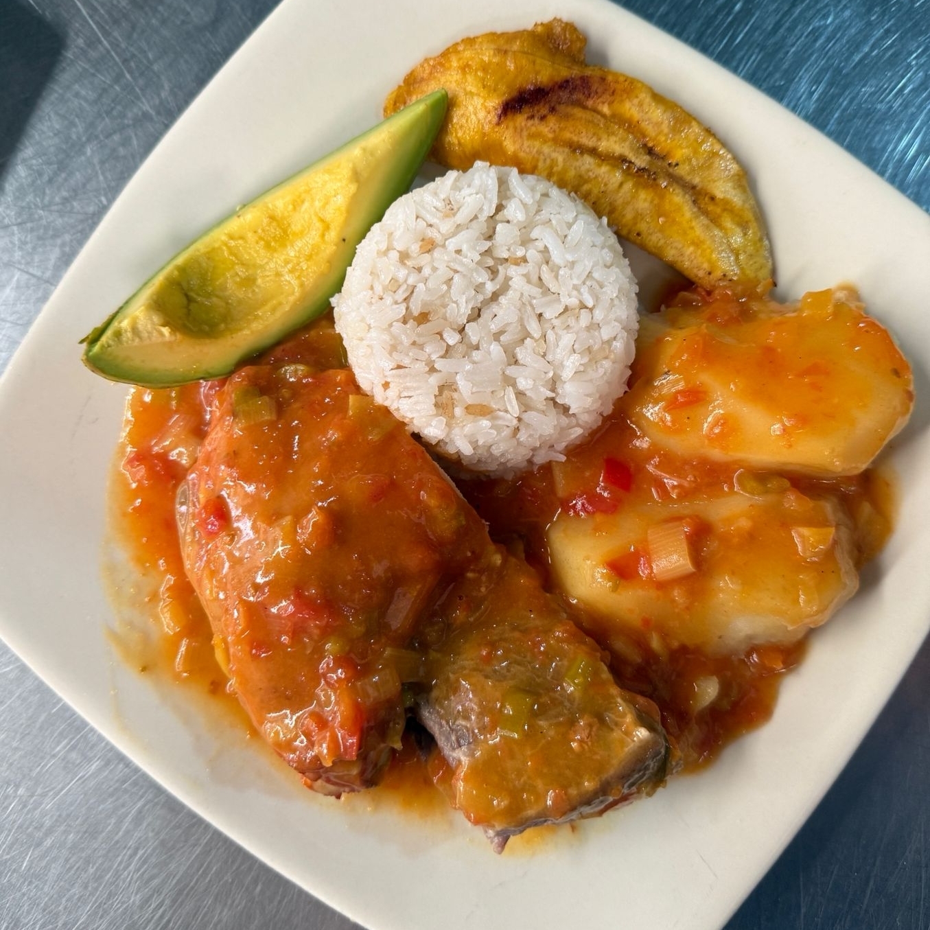 CAZUELA, ARROZ, PLATANO Y AGUACATE.