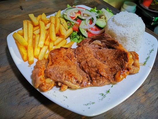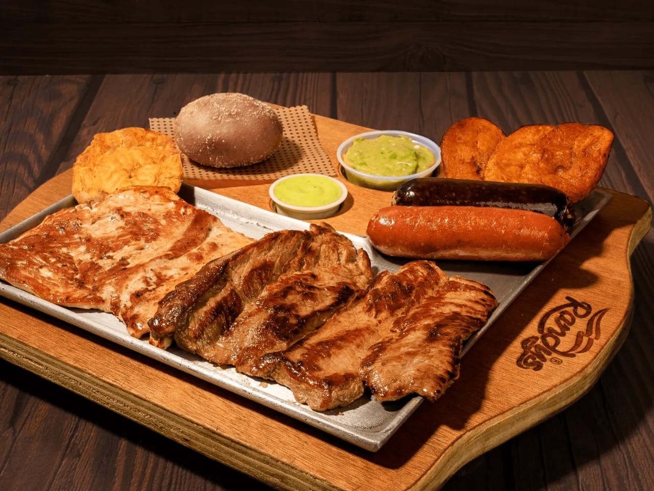 Carne de res, cerdo, pechuga y chorizo. Acompañada con arroz blanco, ensalada tradicional, papa francesa y plátano