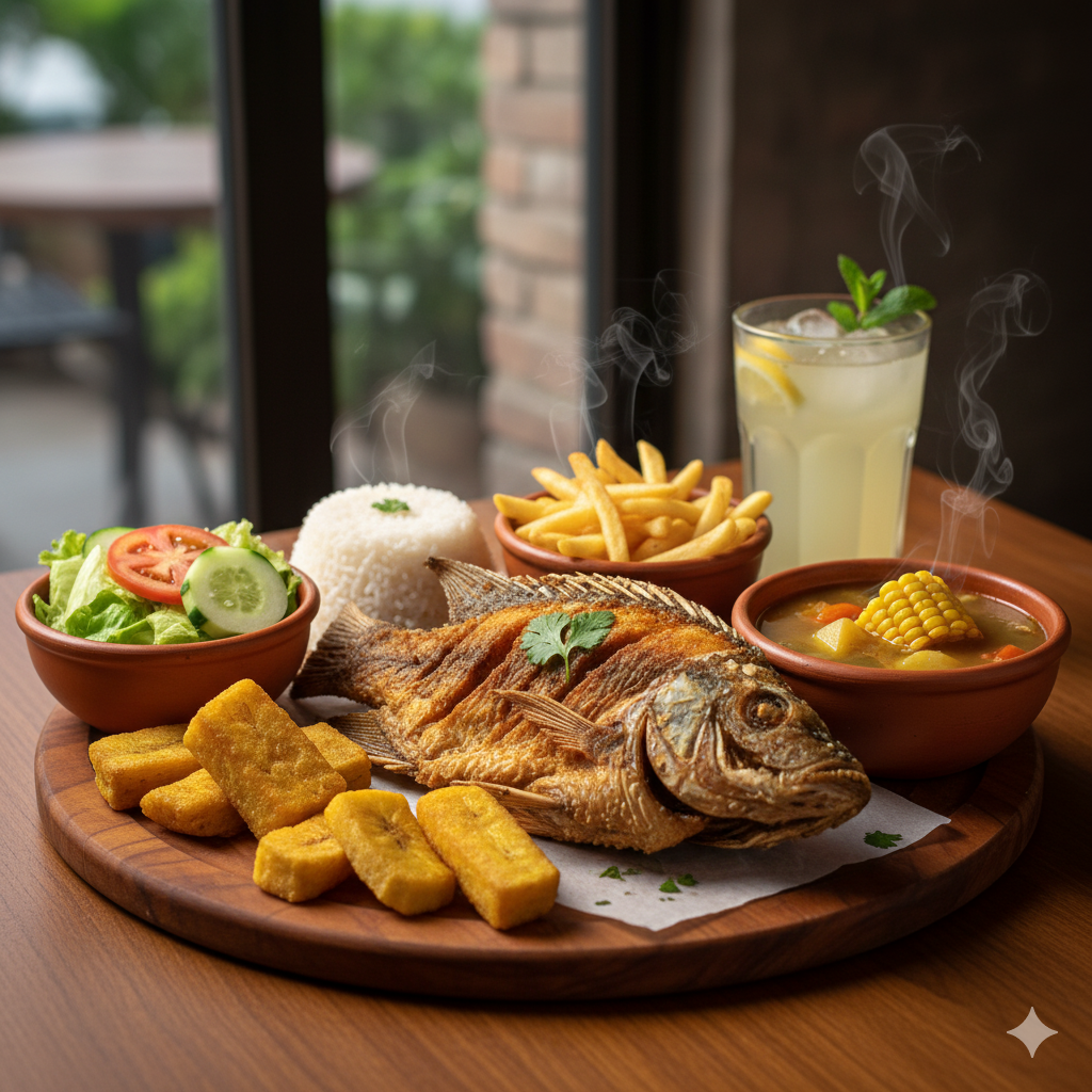 Arroz blanco, ensalada tradicional, papa francesa, patacón o croquetas de yuca, más sopa del día y limonada natural 12 oz.