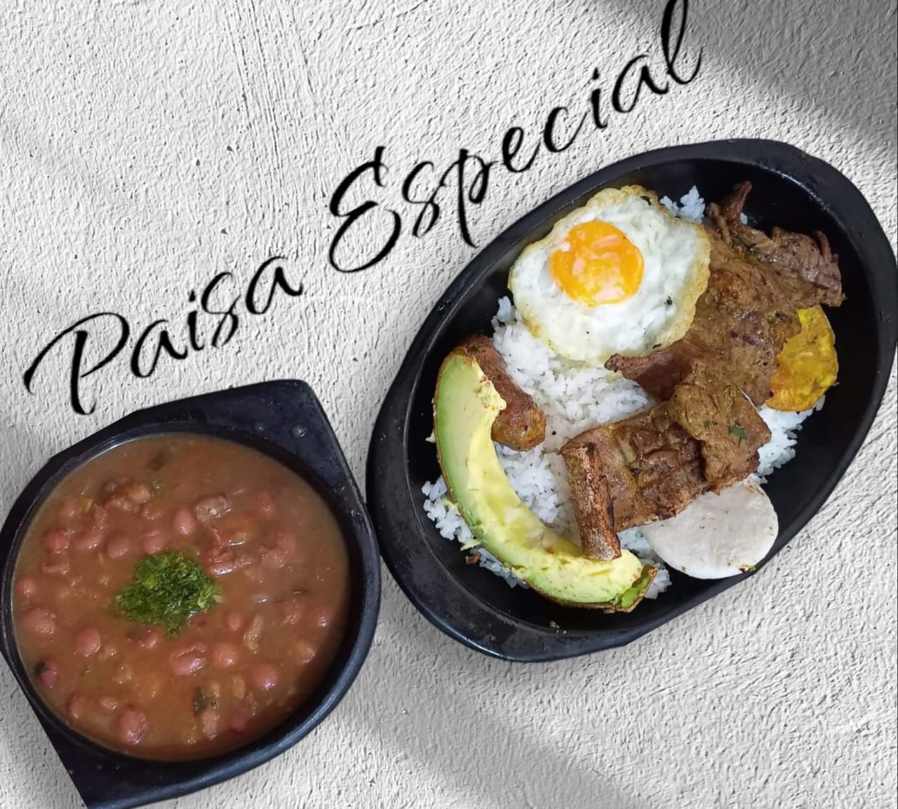 Porción personal: Sopa, Frijol, Tajada de maduro, Arroz, carne Molida, Huevo, Chicharrón, Chorizo, arepa, Aguacate.