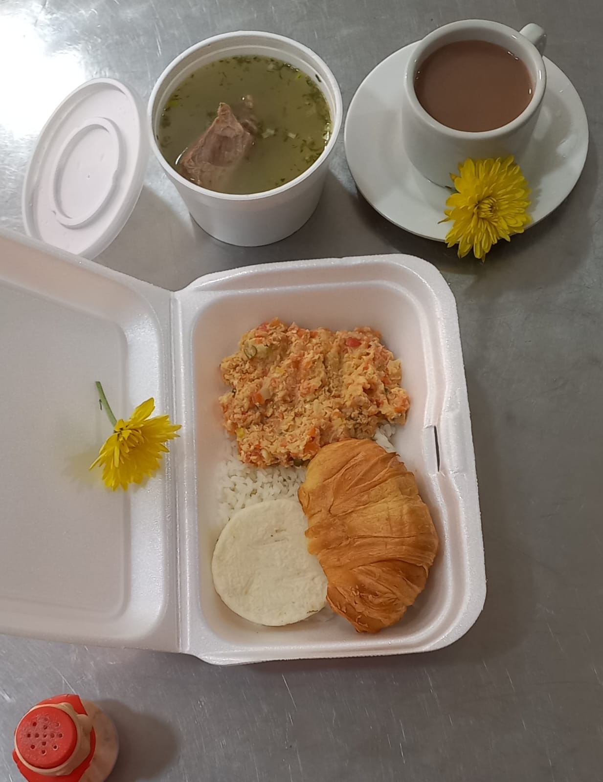 Caldo, calentado de frijol, arroz, frijol, huevo frito, tajada de maduro, arepa de maíz peto, pan y bebida caliente, escoge tu caldo, costilla, pata, changua, escoge tu bebida, chocolate, tinto, café.