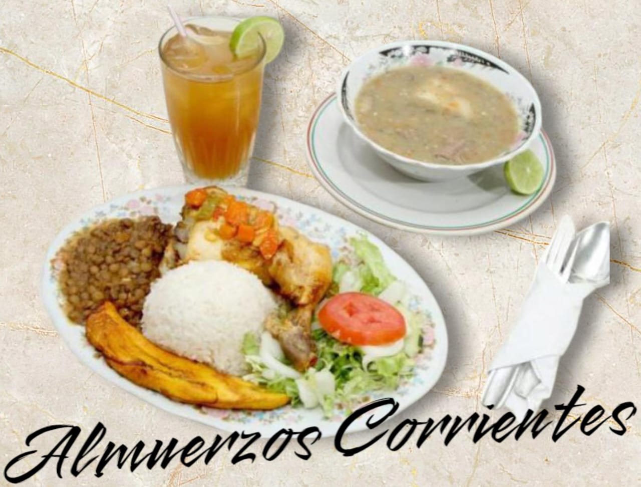 Sopa del día, francesa, arroz, ensalada de la casa, patacón o croquetas de yuca y limonada natural 12 oz.
